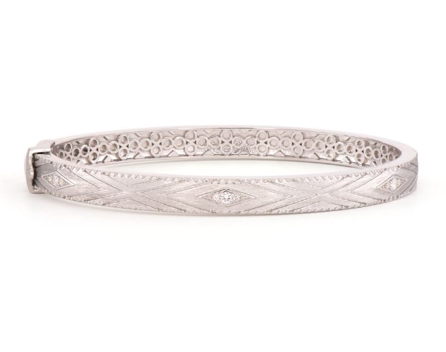 From the Moroccan Collection, the geometric lined milgrain bangle features three bold marquise elements with a engraved lined technique and triangle trim.