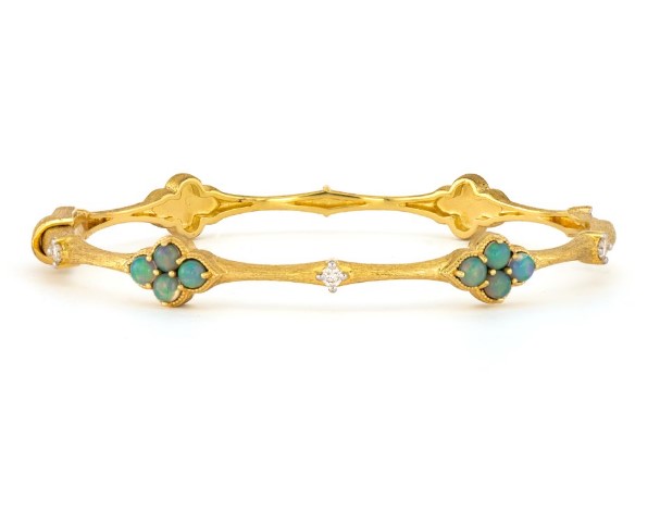 From the Moroccan Collection, the Moroccan Opal Quad Bangle features opal quads alternating with small round white diamonds on a thin 18k yellow gold band in the signature brushed finish.