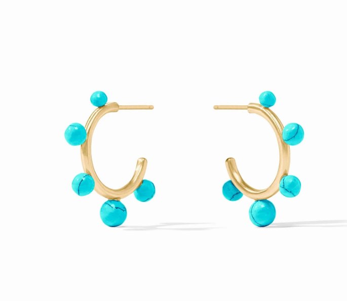 Feather-light, slender golden hoops studded with gumdrop-like gemstones in varying sizes for a wonderfully whimsical look.
