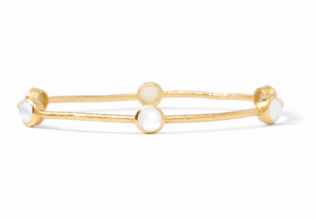 A lightly hammered bangle embellished with six iridescent gemstones stations