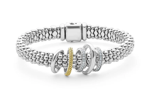 Smooth sterling silver, 18K gold superfine Caviar beading, and diamonds form five stationary rings on a classic sterling silver Caviar rope bracelet.