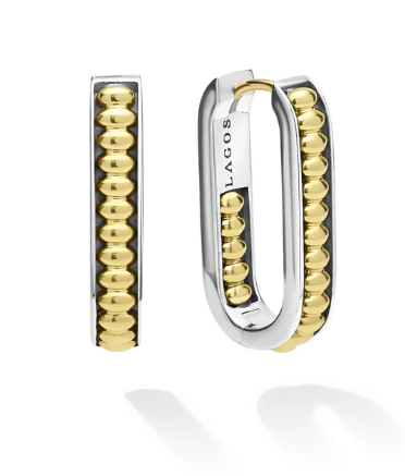 18K gold Caviar beading surrounded by smooth sterling silver forms these linear hoop earrings.