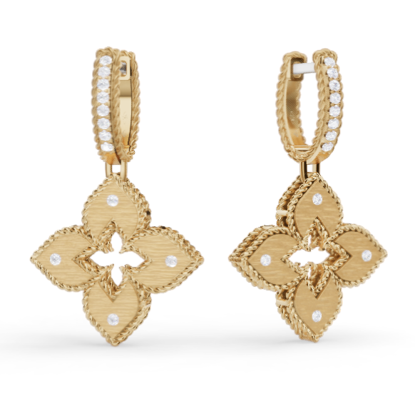 Crafted in 18K gold, these Petite Venetian Princess Flower Drop Earrings feature a delicate satin finish that enhances their elegant floral design. Accented with finely set diamonds, they offer subtle sparkle and timeless sophistication. Perfect for adding refined charm to any ensemble, these earrings merge expert craftsmanship with understated luxury.