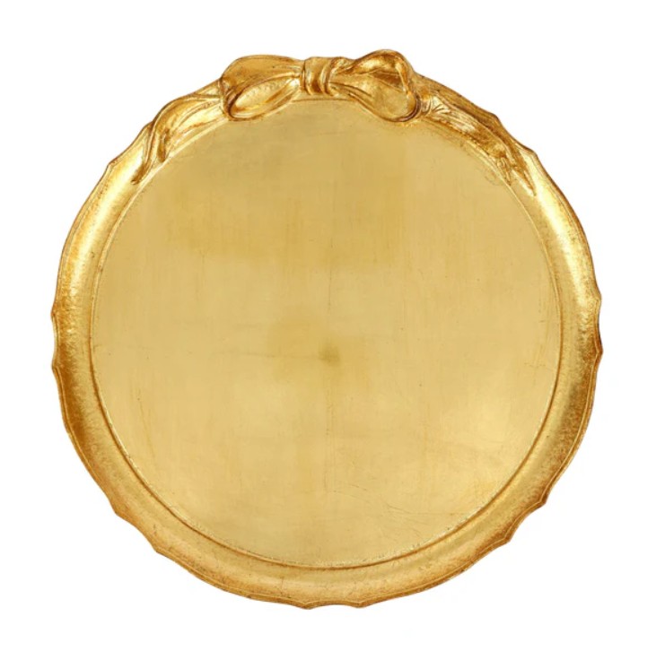 Maestro artisans handcarve each beautiful curve of the Florentine Wooden Accessories Gold Bow Round Tray before applying a signature gold leaf. The delicate bow detail adds an elegant touch to this timeless piece, handcrafted in Florence, Italy, home to the Renassiance and the influential Medici family.