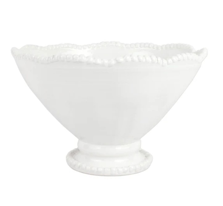 Characterized by a strand of pearl-like designs around the rim of each piece, the Perline Short Footed Cachepot is sophisticated and polished. The white glaze is rich and resplendent, and it makes for a beautiful backdrop for any planted flower or arrangement.